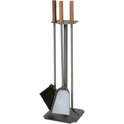 Das Kaminbesteck in schlichtem und dennoch edlem Design passt gut zu fast jeder Wohnzimmereinrichtung. Sowohl das Besteck selbst als auch die Halterung bestehen aus anthrazit beschichtetem Metall. Besen, Schaufel und Schürhaken verfügen über Griffe aus Nussholz, die das elegante Design des Kaminbestecks abrunden.