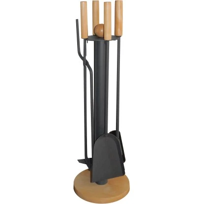 Diese praktische Kamingarnitur besteht aus einer Halterung und einem 4-teiligen Besteckset. Dieses setzt sich zusammen aus einer Schaufel, einem Besen, einem Schürhaken sowie einem Kaminschaber. Die Halterung sowie das Besteck sind in anthrazit beschichtet und verfügen über einen Holzsockel und Holzgriffe.